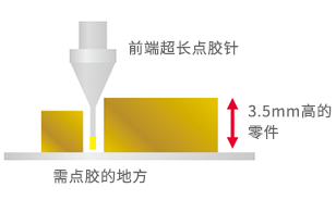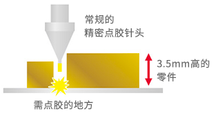 作為解決方案,點(diǎn)膠針的最前端必須要高于旁邊的零件,至少達(dá)到4.5mm以上。因?yàn)榻M建方式和標(biāo)準(zhǔn)頂針,內(nèi)部存在段差,會(huì)發(fā)生材料堵塞和硬化。所以在維持能夠?qū)?xì)小的地方進(jìn)行穩(wěn)定的精密點(diǎn)膠這一性能的基礎(chǔ)上,非常需要前端加長(zhǎng)的新型點(diǎn)膠針。